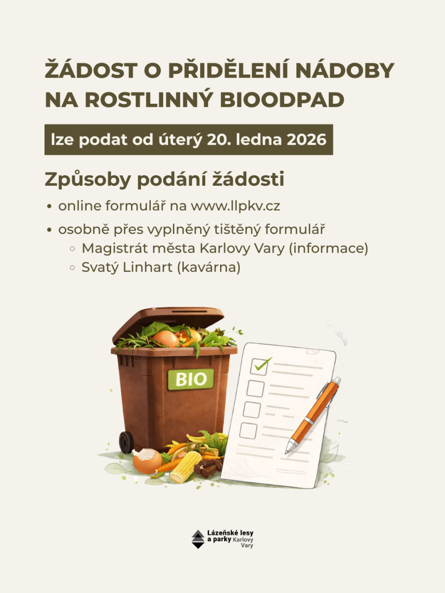 Žádosti o přidělení nové nádoby na bioodpad je možné podávat od 20. 1. 2026 a dále po celý rok prostřednictvím elektronického formuláře na webu https://www.llpkv.cz/sluzby-pro-obcany/bioodpad. Pro občany, kteří preferují osobní vyřízení, je formulář k dispozici také v tištěné podobě na sídle LLPKV na Svatém Linhartu (kavárna Svatý Linhart) a také na informacích Magistrátu města Karlovy Vary v Moskevské ulici, a to vždy v provozní době. Po odevzdání vyplněného formuláře bude požadavek v následujících dnech zpracován.