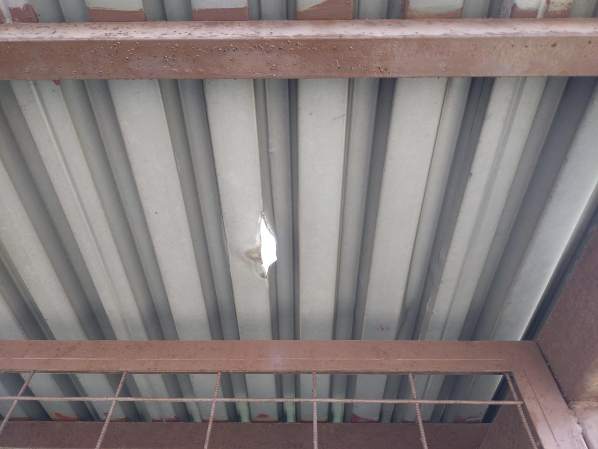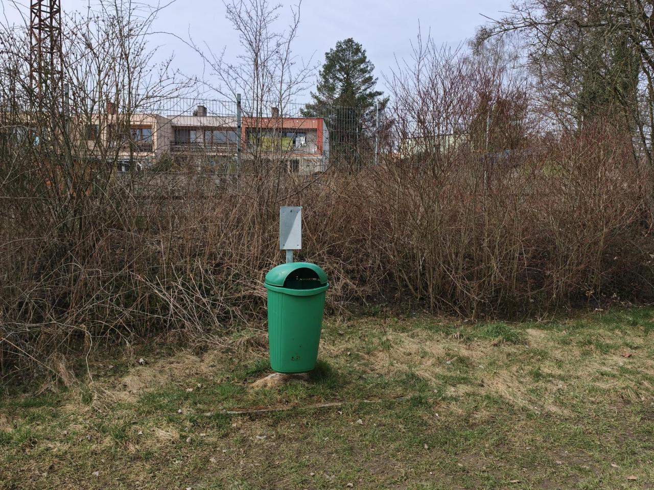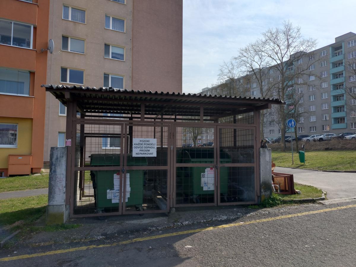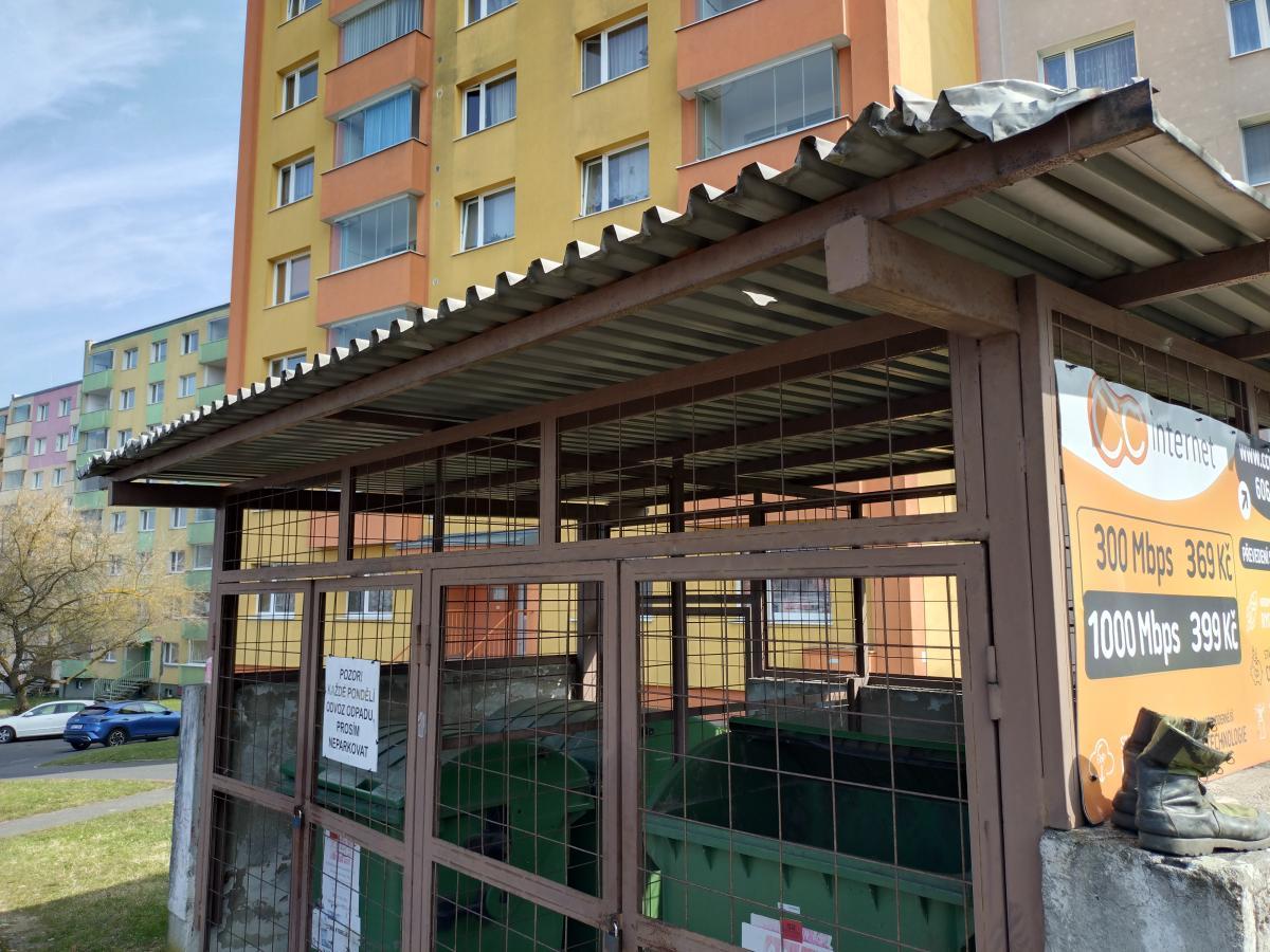 Střecha u stanoviště na popelnice je poškozená, zatéká a je nutná její oprava, aby nedocházelo k dalším škodám a zhoršování stavu.
