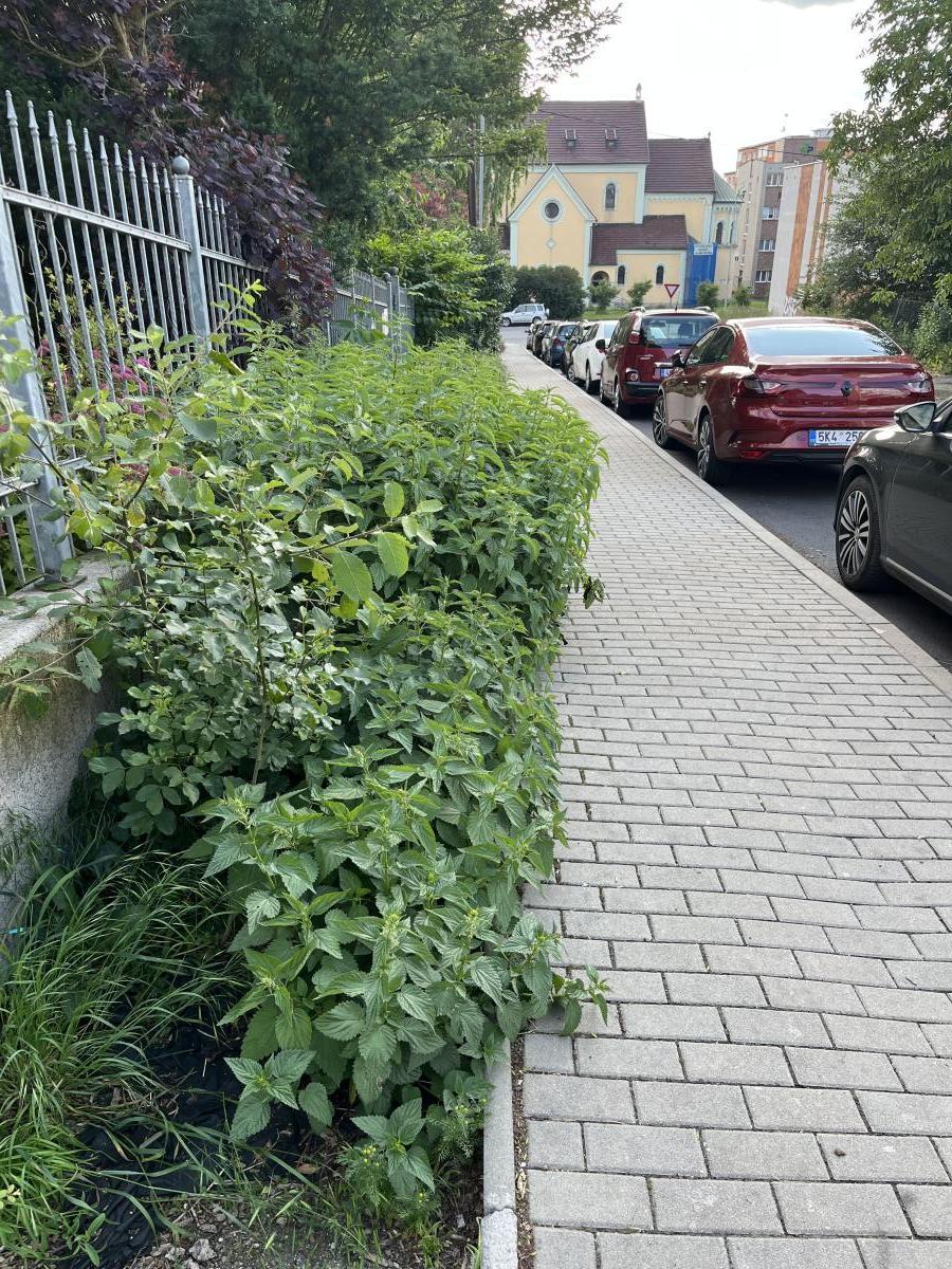 Neudrzovany pas zelene v ulici Buchenwaldska, vedle maleho parku Rybare. Pas je prorostly koprivami a ve spodni casti skalnik prerusta do pul chodniku