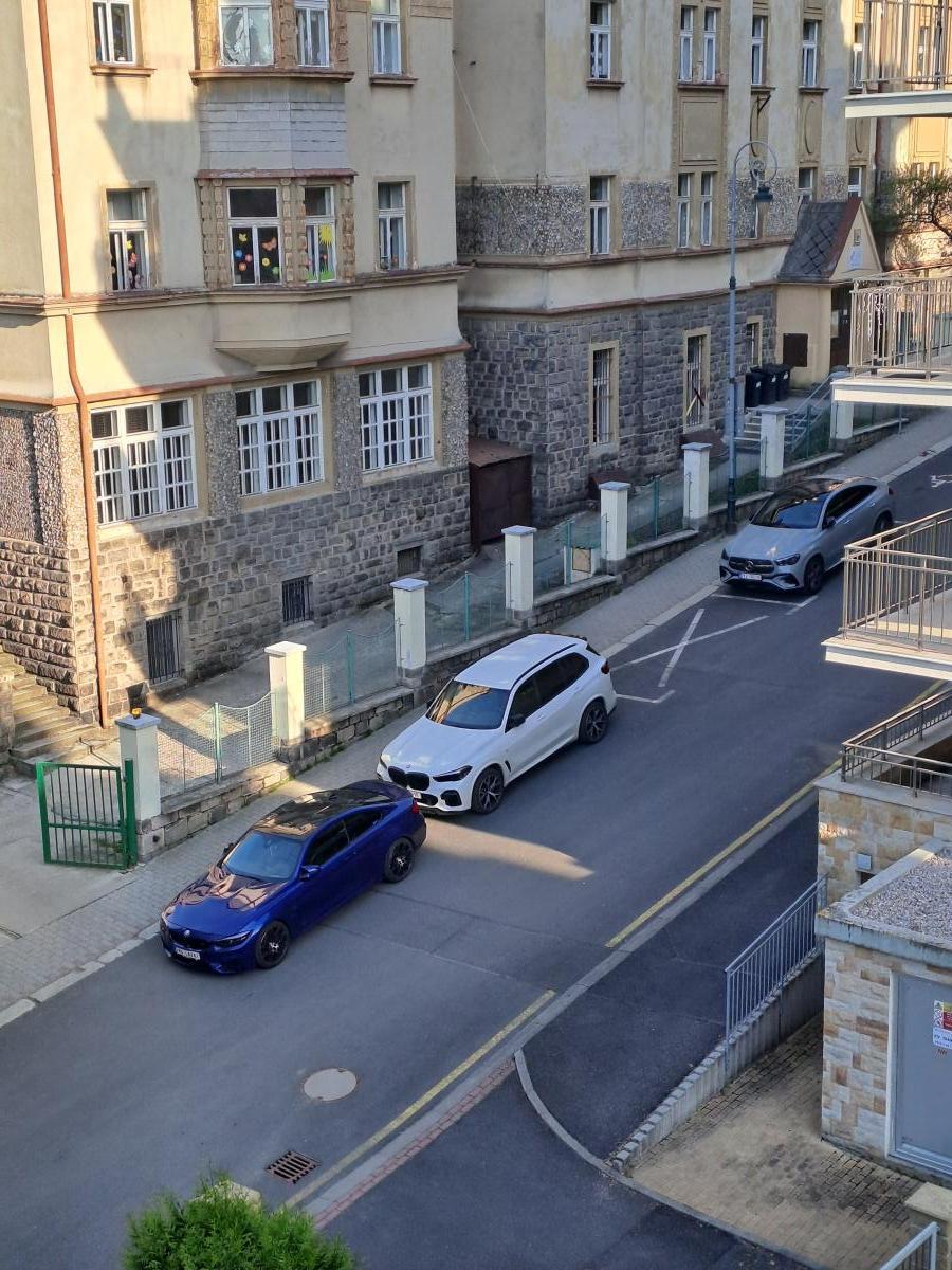 Několik dní blokuje BMW s pražskou poznávací značkou bez parkovací karty nyní před Zvláštní školou, různá parkovací místa ve Svahové ulici