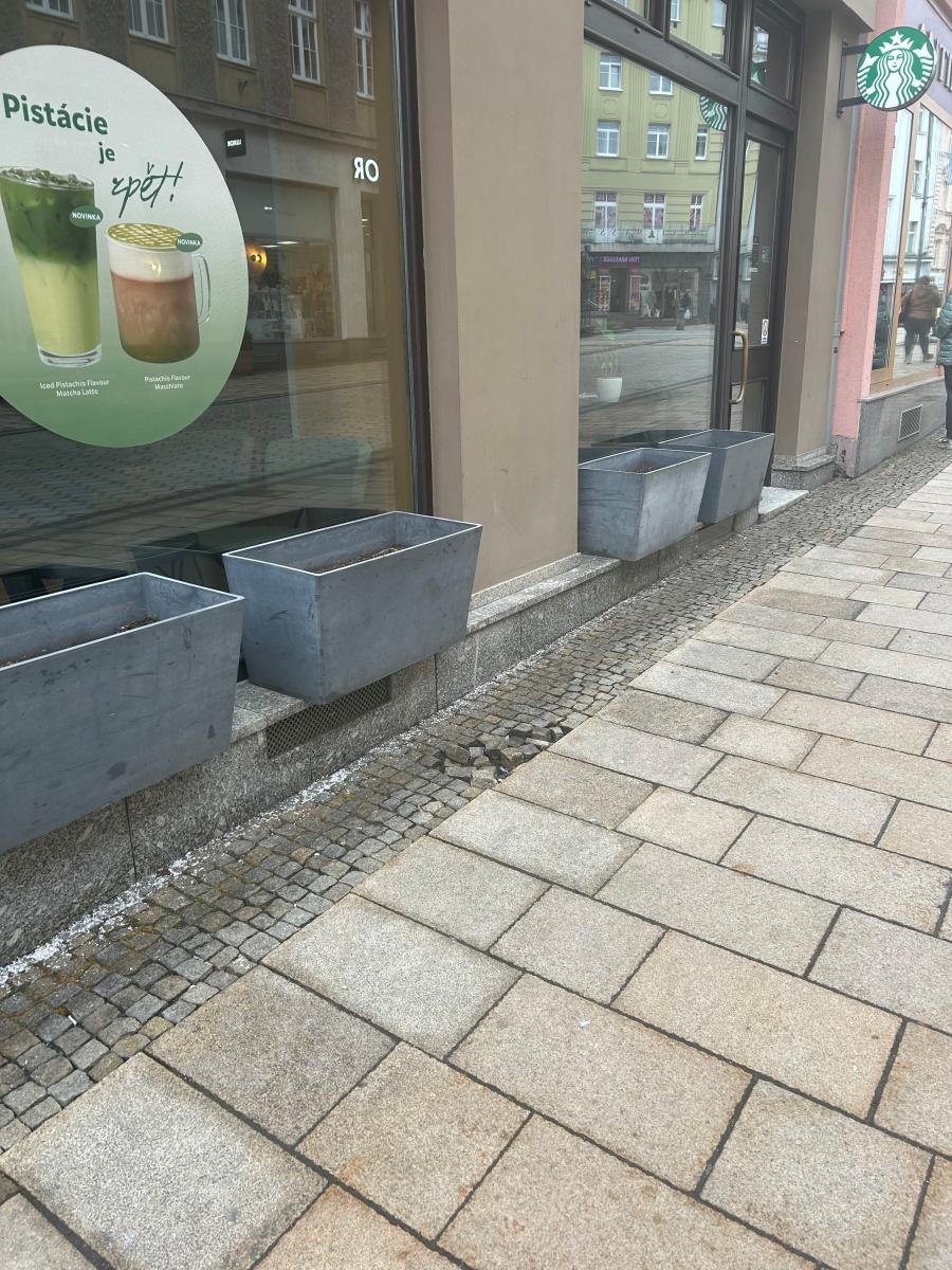 U objektu Jugoslávská 856/2, směrem do ulice T.G.M., před kavárnou Starbucks je poškozená a chybějící dlažba. Důvod bezpečnost a ochrana majetku.