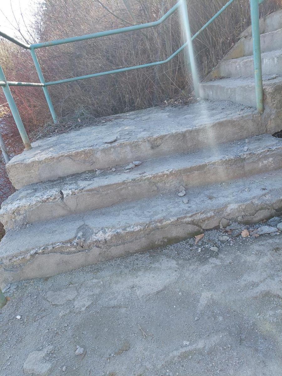 Porušení povrchu schodiště z Fričovy ulice k železničnímu přejezdu. Povrch je nerovný odlupují se betonové