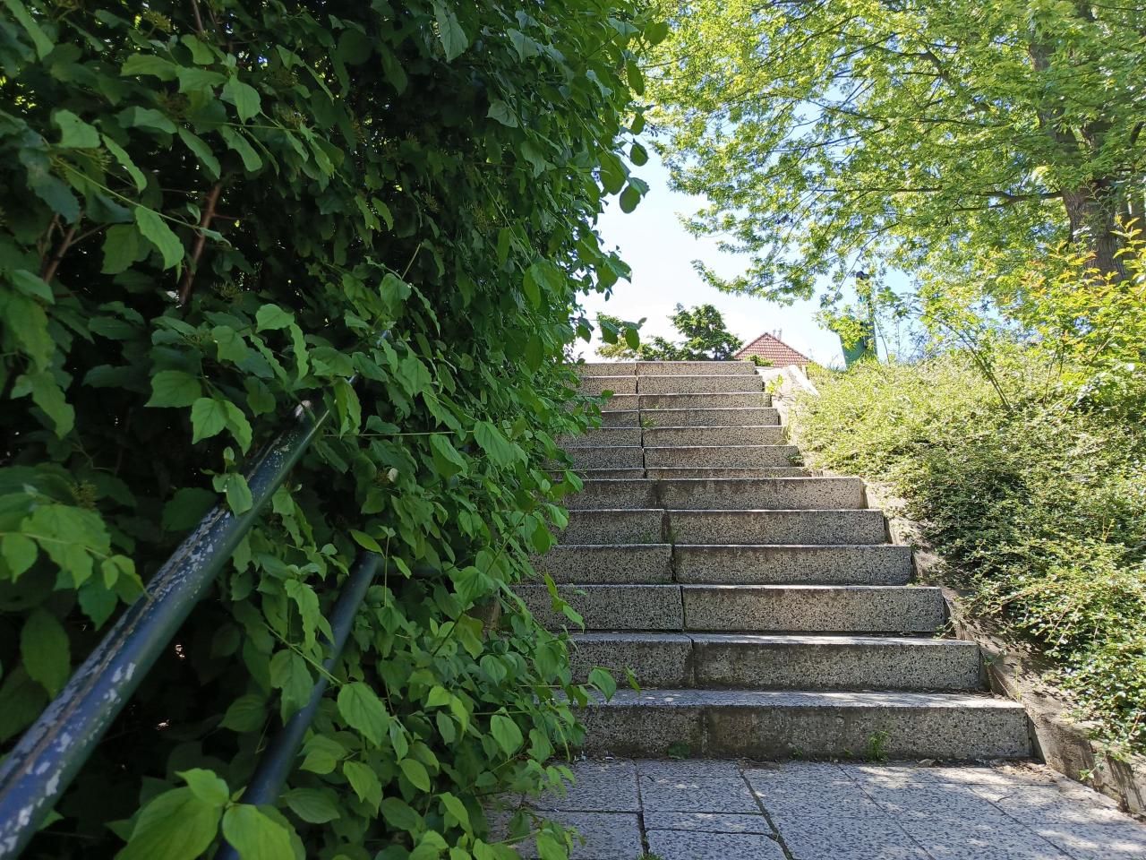 Na sestupu po schodišti mezi ulicemi Vodárenská a Sedlecká,keře prorostly do zábradlí a činí sestup špatně kontrolovaný.
