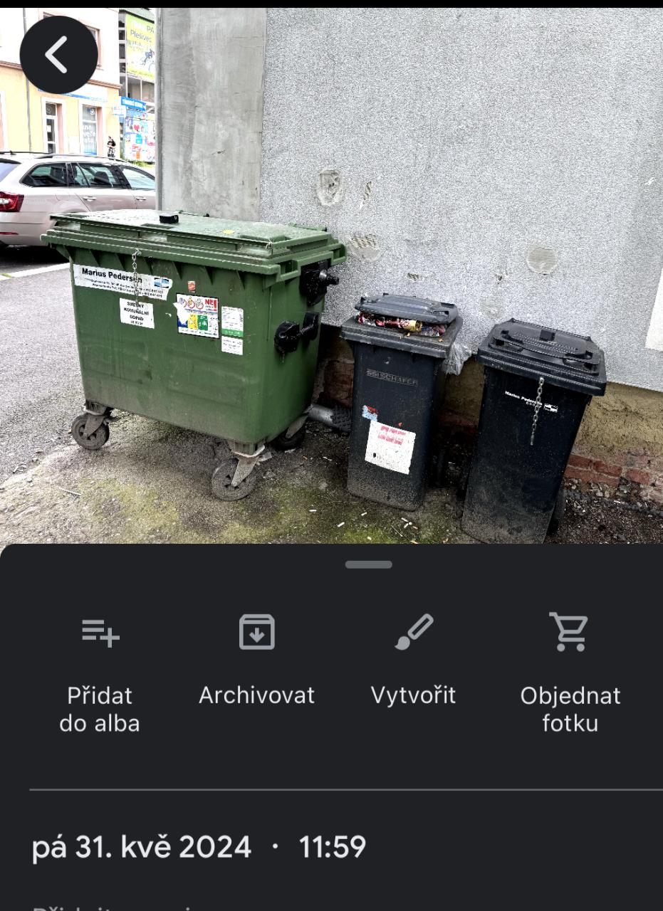 Vedle obchodního centra Meteor se vedle sebe nachází několik nádob na tříděný odpad. Nepořádek kolem nich je extrémní, lidské exkrementy, špína, střepy, stříkačky, doslova humus a to již roky. Může to tam začít někdo, ale opravdu pořádně, udržovat popřípadě nelze popelnice přesunout více do prostoru, aby na ně bylo lépe vidět a neděly se kolem nich věci jako doposud?