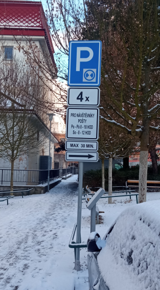 prosím o zrušení omezení parkování v sobotu u pošty ve Školní ulici, pošta má v so zavřeno. Důvod: nedostatek parkovacích míst.