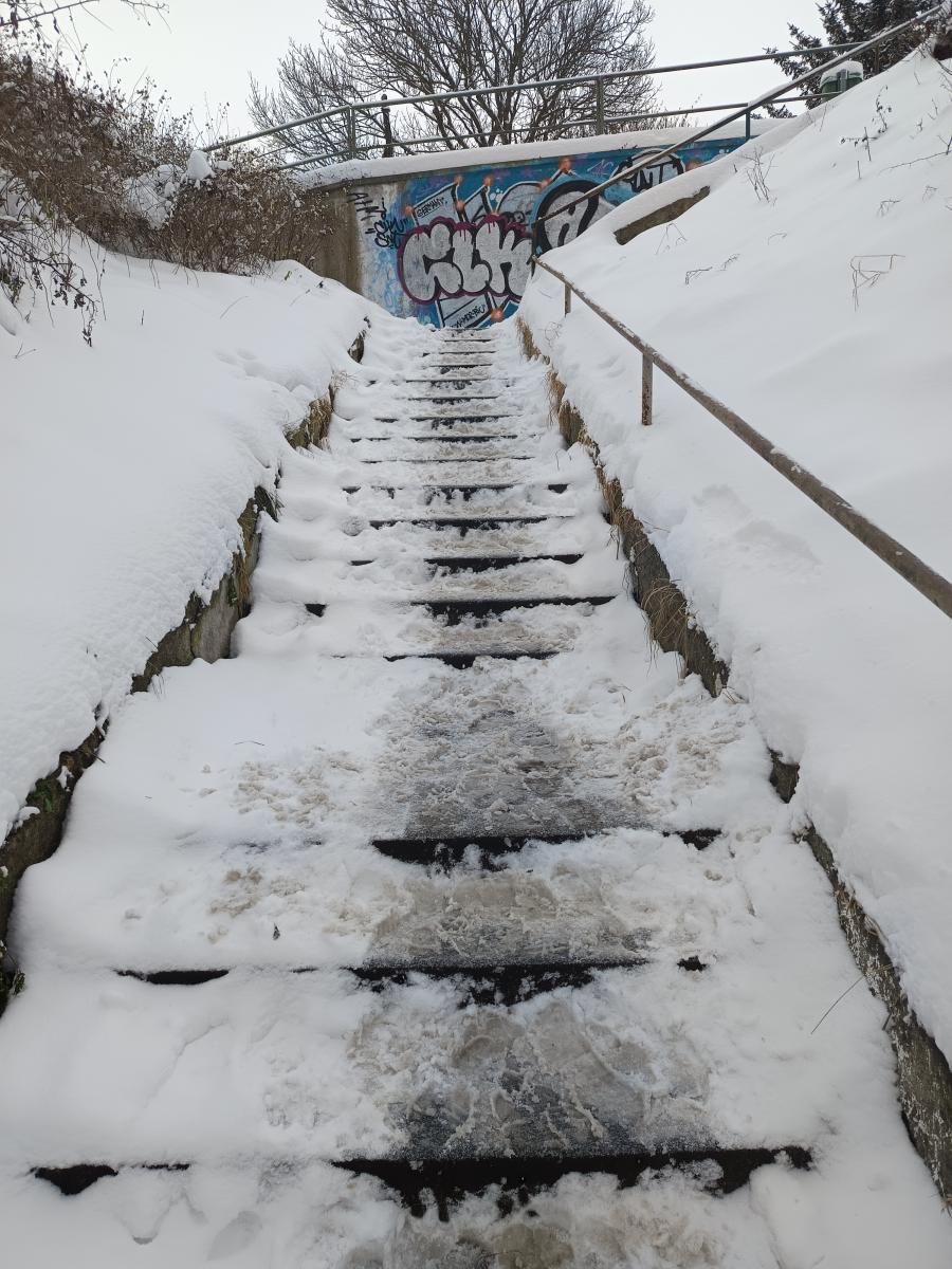 Prosíme o odklizení schodů a přilehlého mostu přes průtah. Je to jediná cesta kudy chodí lidé do práce a do školy a je neschůdná. Děkuji.
