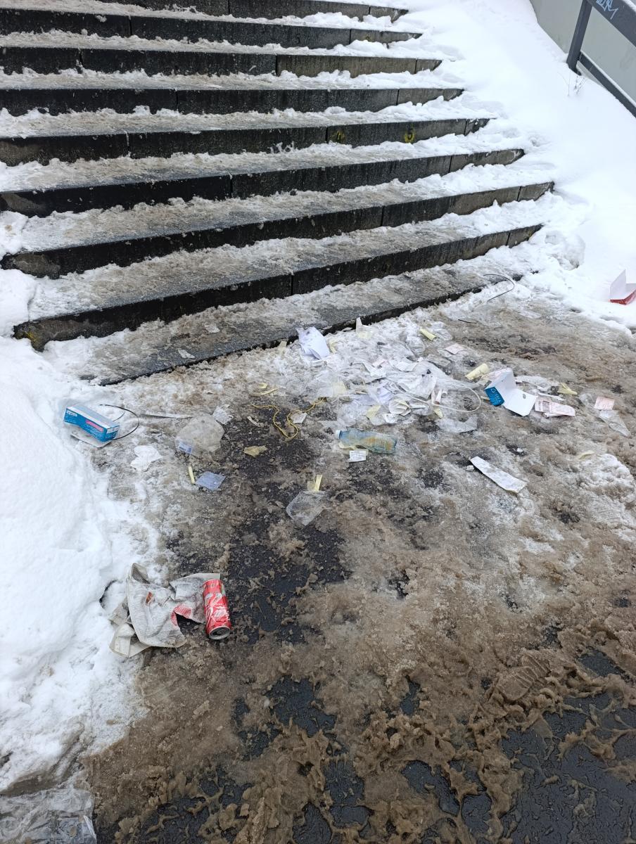 Opět neuklizené schody Bohatice - směr Drahovický most. Na schodech jsou boule sněhu - dnes jsem při cestě do práce upadla, stále stejný stav.