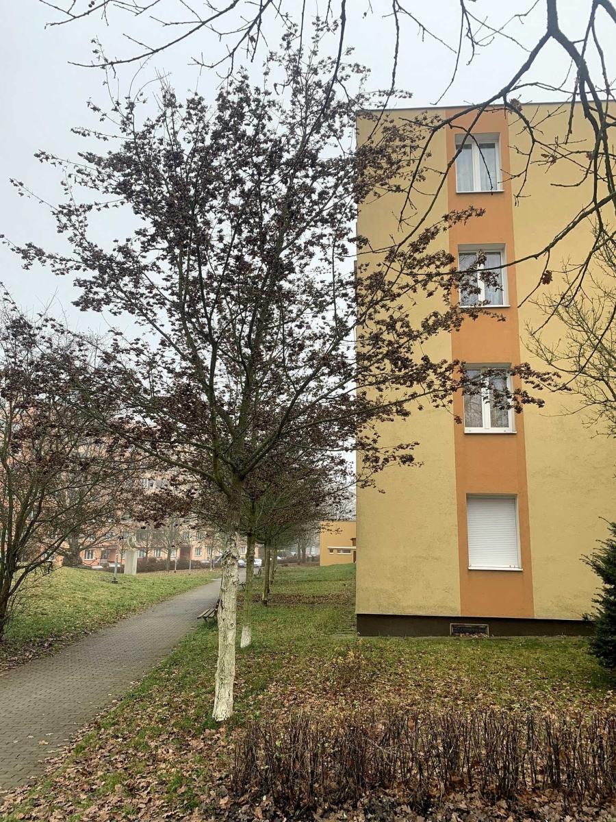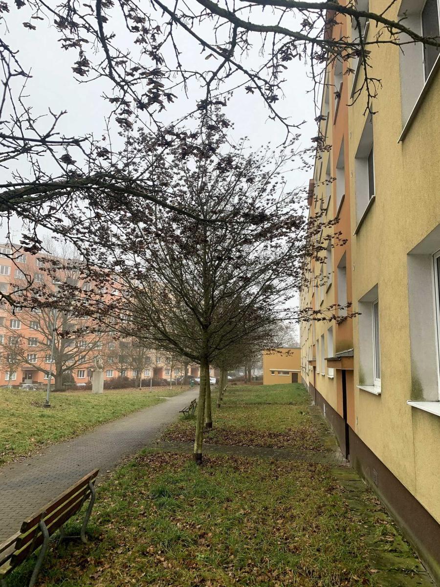 Javory vysázené podél chodníku za domem Okružní 650 - 653 jsou vzdáleny od fasády sotva 2 m a poškozují ji. Větve tlučou i do oken a parapetů.