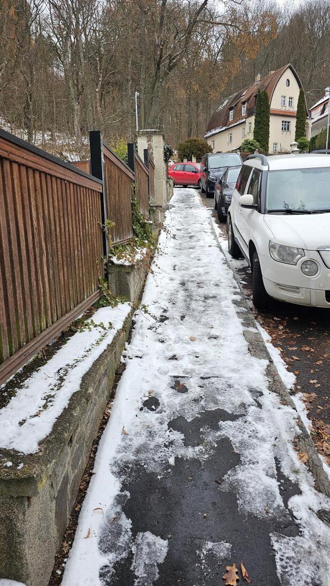 Bylo by možné uklízet sníh z chodníků v ul. Na Vyhlídce také před domy č. or. 21–27? Podotýkám, že dnes probíhalo ruční odklizení a solení, takže obvyklá výmluva, že tam neprojede technika, neobstojí.