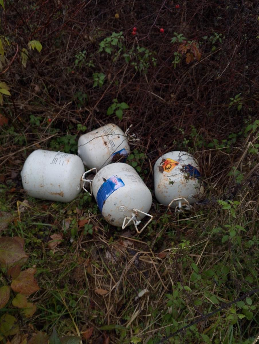 Černá skládka dvůr I.P.Pavlova vedle výměníku u sběrných nádob-kontejnerů u zdi domu rám postele, 2 menší plastové láhve od plynu...