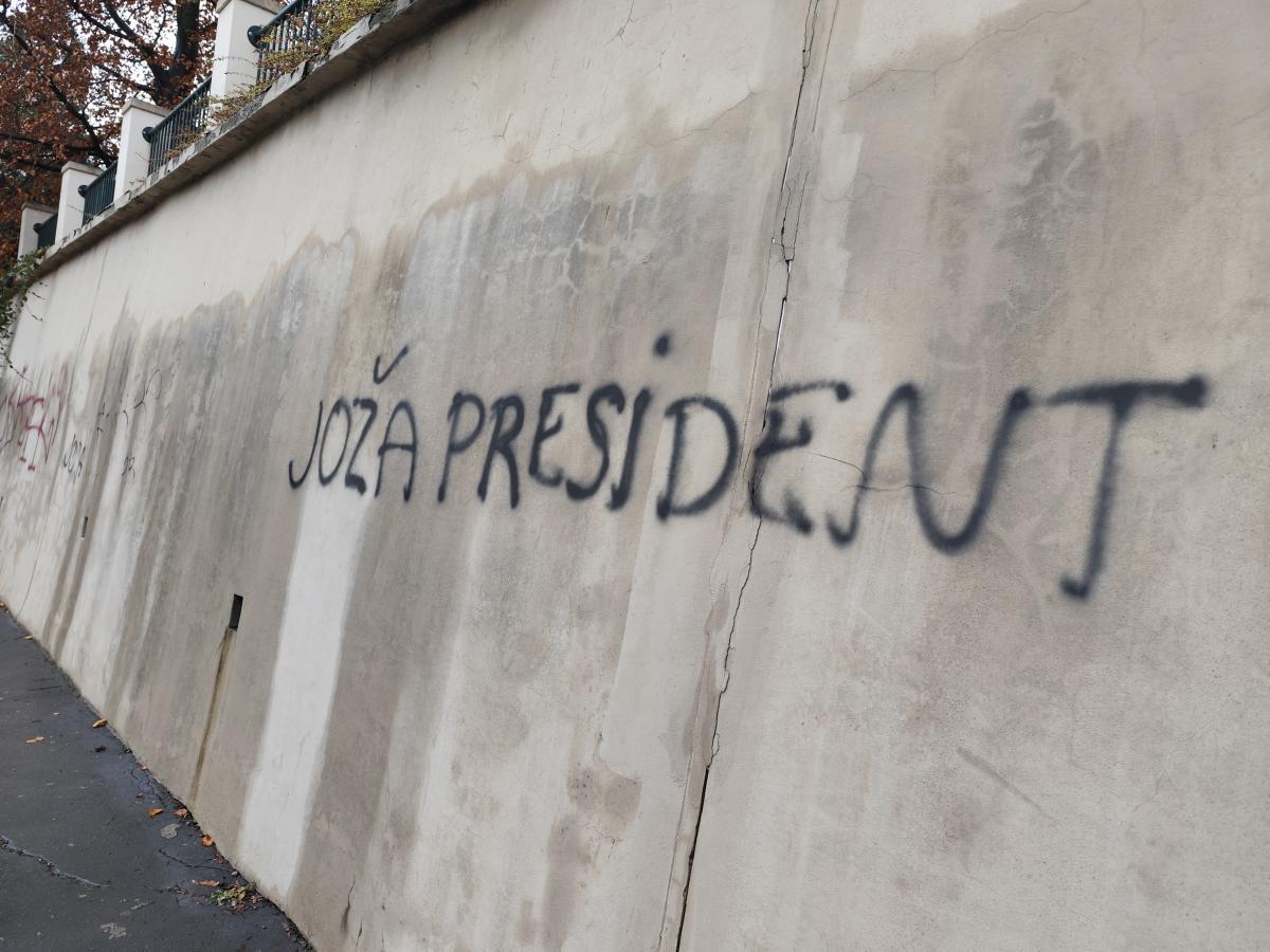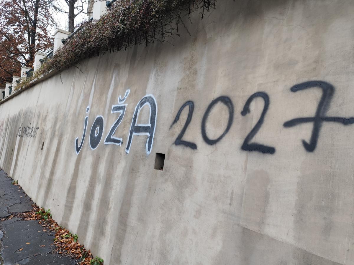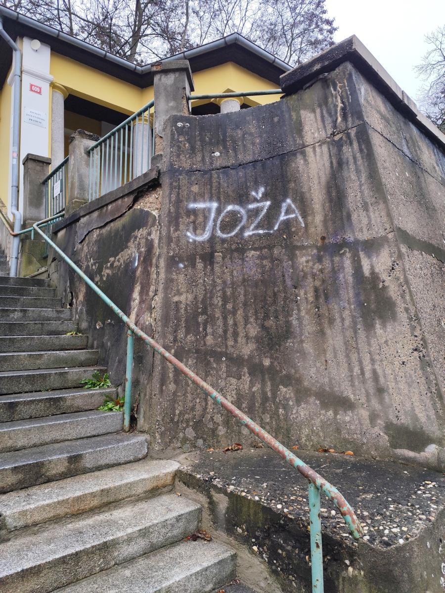 Posprejované zdi obchodní akademie a Železnatého pramene. Stejné nápisy jako nedávno odstraněné na Ostrovském moste a jiných částech města.