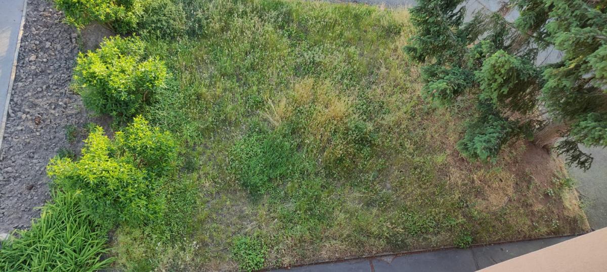 zatím byla upravena zeleň pouze v části dvora - okolo lampy, zbytek pod zdí dvora, na jaře upravený mulčem, je stále zarostlý, budete, prosím, pokračovat?