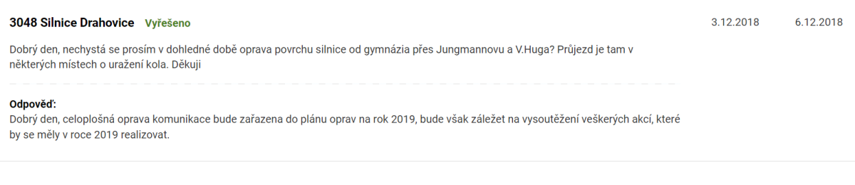 Před několika lety jste na této stránce slibovali opravu ulice V. Huga (slovy "příští rok je v plánu rekonstrukce")... mezitím uplynulo asi pět let, loni se dělaly výkopy na optiku a oprava je stále v nedohlednu... upustilo se tedy nakonec od toho? Pokud se tedy nakonec rekonstrukce ulice nechystá, bylo by prosím možné udělat alespoň ten roh, kde přechází Jungmannova na V. Huga, kde už se to párkrát lepilo, ale velmi nedostatečně. Děkuji MK